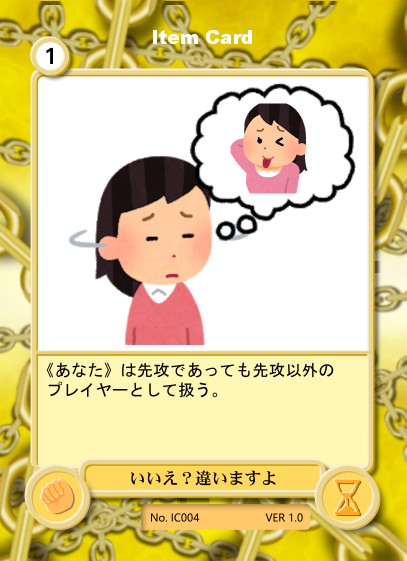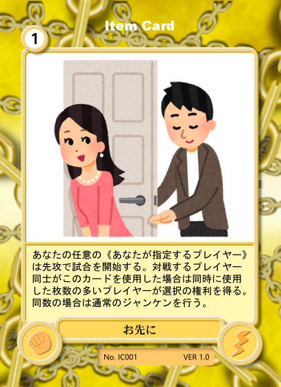 デザインの意図としては、このカードを使う事でジャンケンをせずに先攻後攻を決めることができるという効果です。ただし、対戦相手も同じカードを使用する可能性があるため、同数の場合は通常のジャンケン(使い損)となり、確実に選択の権利を得たければ複数使う事で確実性を高めるという形にしました。自分のデッキタイプに応じて自分が先攻を取るか、相手に取らせるかを決めて下さい。
