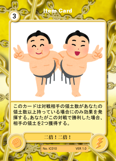 国盗りアンエイジイベント専用になる内容のカードです。勝てば相手の領土を2つ獲得できます。ゲームには何も影響しないので、勝利は実力で手にして下さいね。カードのネタが古いですね・・・。